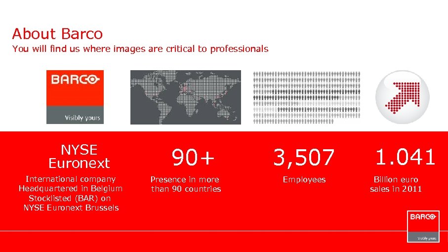 About Barco You will find us where images are critical to professionals NYSE Euronext International company Headquartered in Belgium Stocklisted (BAR) on NYSE Euronext Brussels 90+ Presence in more than 90 countries 3, 507 Employees 1. 041 Billion euro sales in 2011
