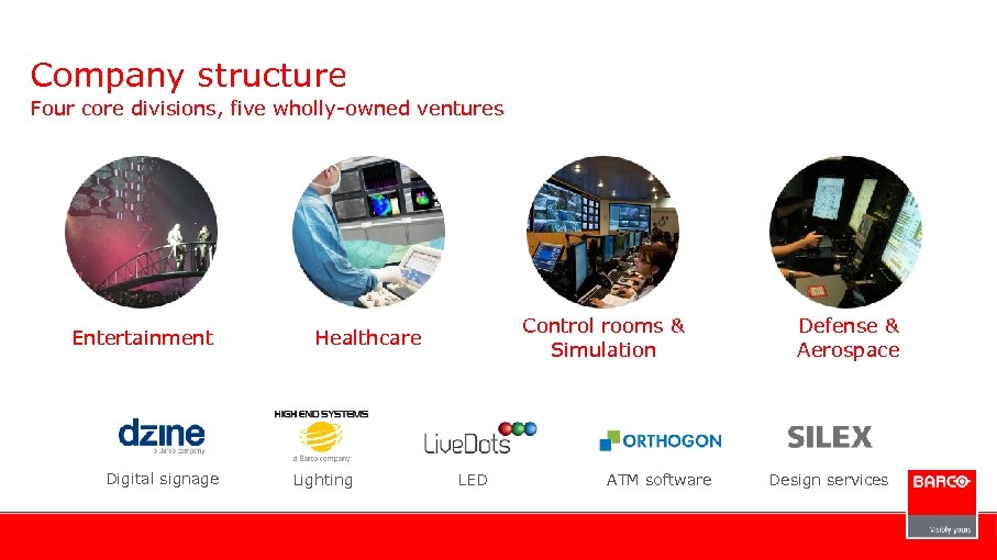 Company structure Four core divisions, five wholly-owned ventures Entertainment Digital signage Control rooms & Simulation Healthcare Lighting LED ATM software Defense & Aerospace Design services