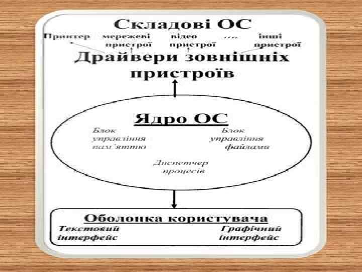 v Ядро – контролює всі події, які відбуваються в обчислювальній системі, і забезпечує спільне використання ресурсів виконуваними програмами. v Драйвери пристроїв забезпечують керування апаратними пристроями комп'ютера, які забезпечують обмін даними між процесором і периферійним обладнанням введення-виведення інформації. v Оболонка – командний інтерпретатор. Робота з ОС здійснюється шляхом уведення команд, які інтерпретуються оболонкою і передаються на виконання ядру.