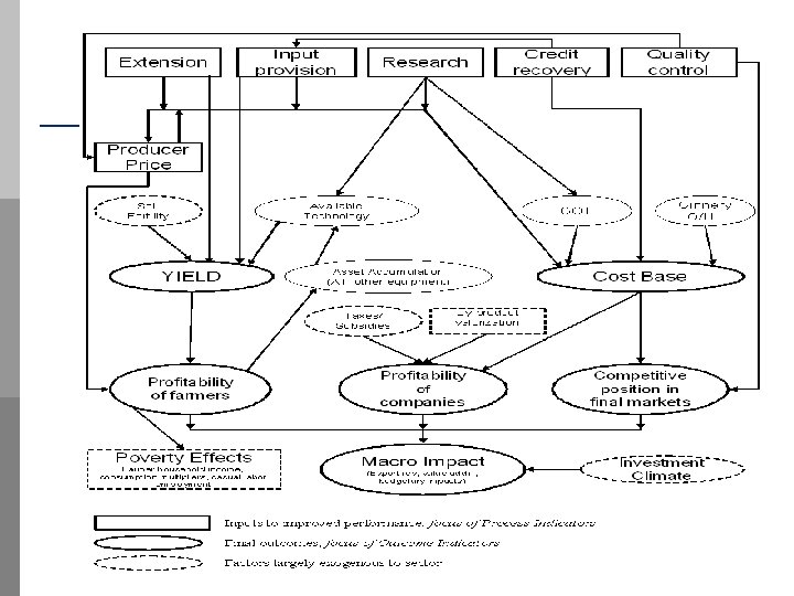Conceptual Framework 4 steps: p Typology of Cotton Systems (see Chart on next slide) n n n National Monopoly Local Monopoly (Concession) Concentrated Competitive Hybrid p Mapping SSA Cotton Sectors (see Chart on following slide) p Indicators of Performance (see Chart on following slide) n Process: Core activities and Service Delivery (prices paid to farmers, input credit delivery, quality, valorization of by-products, research) n Outcomes: yields and returns to farmers, value addition, efficiency and competitiveness, macro-impact p Linking Performance to Sector Types by analyzing sector performance vs the selected indicators