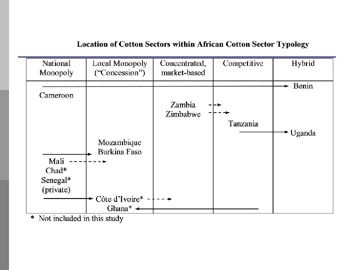 Provisional Conclusions: Final Reflections on Sector Types and Looking Ahead p Some degree of convergence in the forms of cotton sector organization in Africa likely to happen over the next decade n Increase in the number of local monopoly systems in the short/medium term? p Transition to concentrated systems desirable, if regulatory challenges can be overcome p More competitive systems are probably part of the long -term future in most countries n Need more effective rural financial markets and farmers’ organisations first