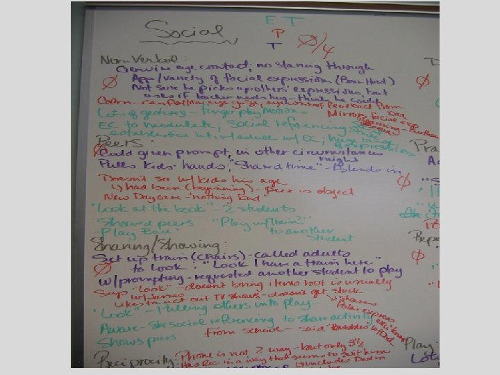 KEY COMPONENT #3 Results Review Meeting • Only Eval Team present (Psy, SSW, SLP) • List all 12 criteria on board • Color code information (teacher, parent, eval team) • Ask BIG question in each area: Is there a qualitative impairment in socialization? . . . • Discuss each criterion; check criterion that has been reached • Report writer (on computer)