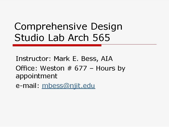 Comprehensive Design Studio Lab Arch 565 Instructor: Mark E. Bess, AIA Office: Weston # 677 – Hours by appointment e-mail: mbess@njit. edu