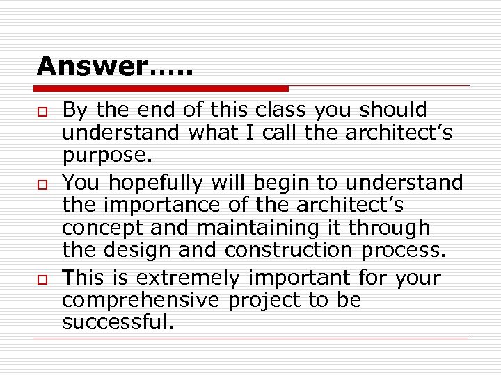 Answer…. . o o o By the end of this class you should understand what I call the architect’s purpose. You hopefully will begin to understand the importance of the architect’s concept and maintaining it through the design and construction process. This is extremely important for your comprehensive project to be successful.