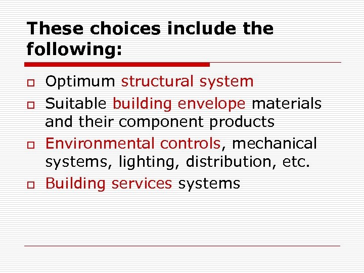 These choices include the following: o o Optimum structural system Suitable building envelope materials and their component products Environmental controls, mechanical systems, lighting, distribution, etc. Building services systems
