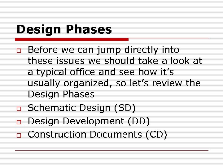 Design Phases o o Before we can jump directly into these issues we should take a look at a typical office and see how it’s usually organized, so let’s review the Design Phases Schematic Design (SD) Design Development (DD) Construction Documents (CD)