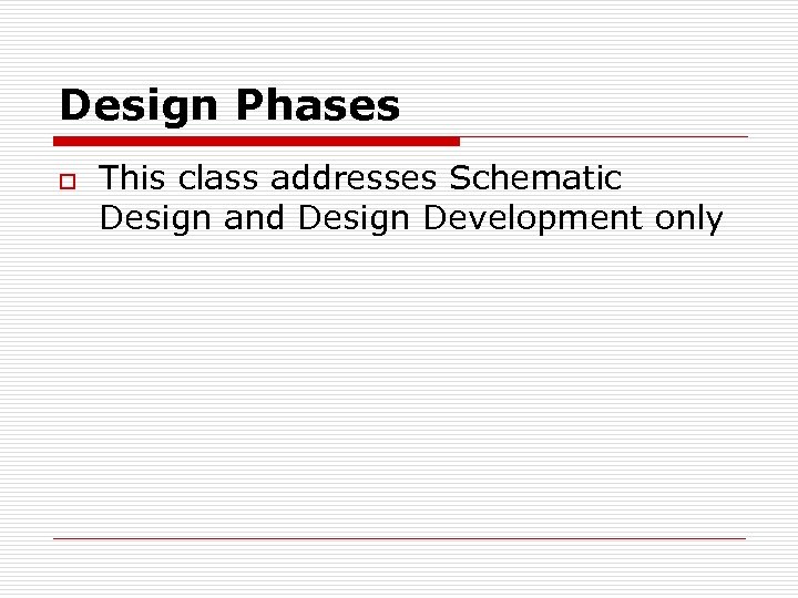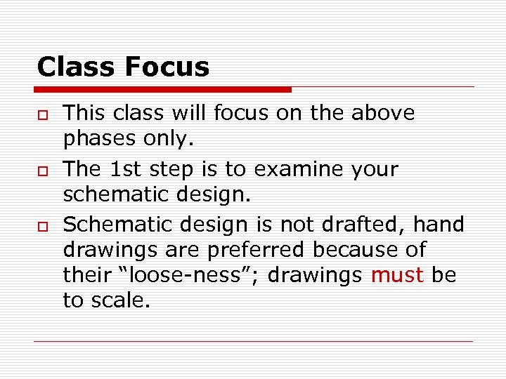 Class Focus o o o This class will focus on the above phases only. The 1 st step is to examine your schematic design. Schematic design is not drafted, hand drawings are preferred because of their “loose-ness”; drawings must be to scale.