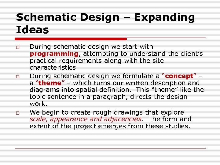 Schematic Design – Expanding Ideas o o o During schematic design we start with programming, attempting to understand the client’s practical requirements along with the site characteristics During schematic design we formulate a “concept” – a “theme” – which turns our written description and diagrams into spatial definition. This “theme” like the topic sentence in a paragraph, directs the design work. We begin to create rough drawings that explore scale, appearance and adjacencies. The form and extent of the project emerges from these studies.