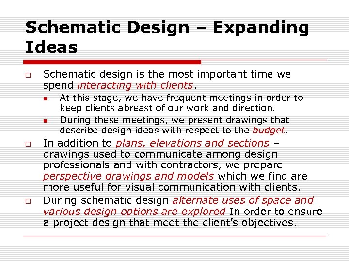 Schematic Design – Expanding Ideas o Schematic design is the most important time we spend interacting with clients. n n o o At this stage, we have frequent meetings in order to keep clients abreast of our work and direction. During these meetings, we present drawings that describe design ideas with respect to the budget. In addition to plans, elevations and sections – drawings used to communicate among design professionals and with contractors, we prepare perspective drawings and models which we find are more useful for visual communication with clients. During schematic design alternate uses of space and various design options are explored In order to ensure a project design that meet the client’s objectives.