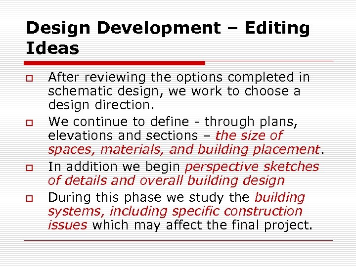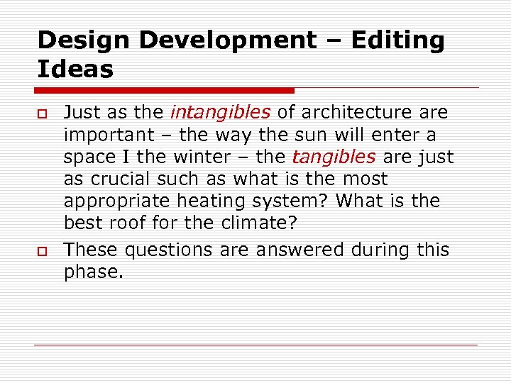Design Development – Editing Ideas o o Just as the intangibles of architecture are important – the way the sun will enter a space I the winter – the tangibles are just as crucial such as what is the most appropriate heating system? What is the best roof for the climate? These questions are answered during this phase.