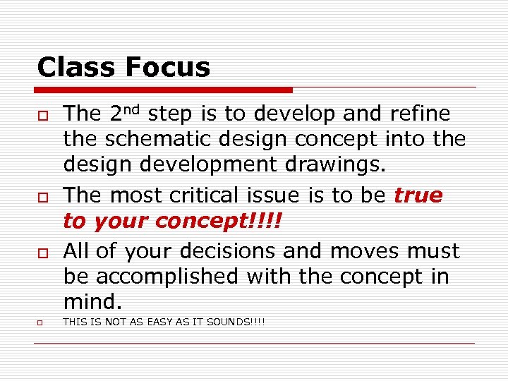 Class Focus o o The 2 nd step is to develop and refine the schematic design concept into the design development drawings. The most critical issue is to be true to your concept!!!! All of your decisions and moves must be accomplished with the concept in mind. THIS IS NOT AS EASY AS IT SOUNDS!!!!