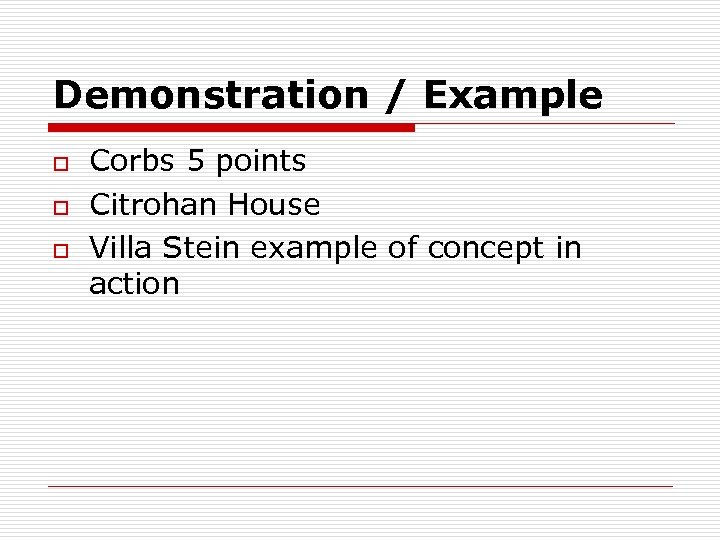Demonstration / Example o o o Corbs 5 points Citrohan House Villa Stein example of concept in action