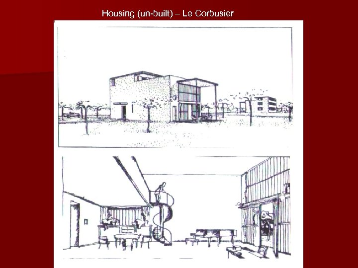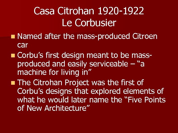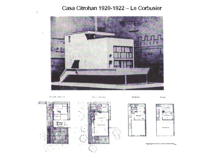 Casa Citrohan 1920 -1922 Le Corbusier n Named after the mass-produced Citroen car n Corbu’s first design meant to be massproduced and easily serviceable – “a machine for living in” n The Citrohan Project was the first of Corbu’s designs that explored elements of what he would later name the “Five Points of New Architecture”