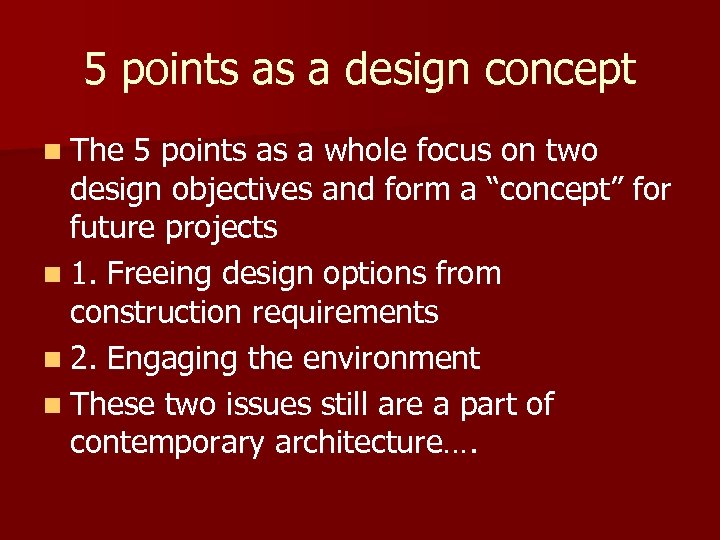 5 points as a design concept n The 5 points as a whole focus on two design objectives and form a “concept” for future projects n 1. Freeing design options from construction requirements n 2. Engaging the environment n These two issues still are a part of contemporary architecture….