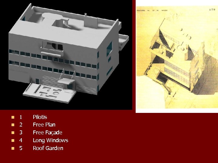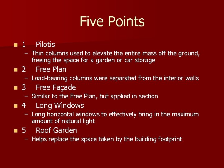 Five Points n 1 Pilotis – Thin columns used to elevate the entire mass off the ground, freeing the space for a garden or car storage n 2 Free Plan – Load-bearing columns were separated from the interior walls n 3 Free Façade – Similar to the Free Plan, but applied in section n 4 Long Windows – Long horizontal windows to effectively bring in the maximum amount of natural light n 5 Roof Garden – Helps replace the space taken by the building footprint