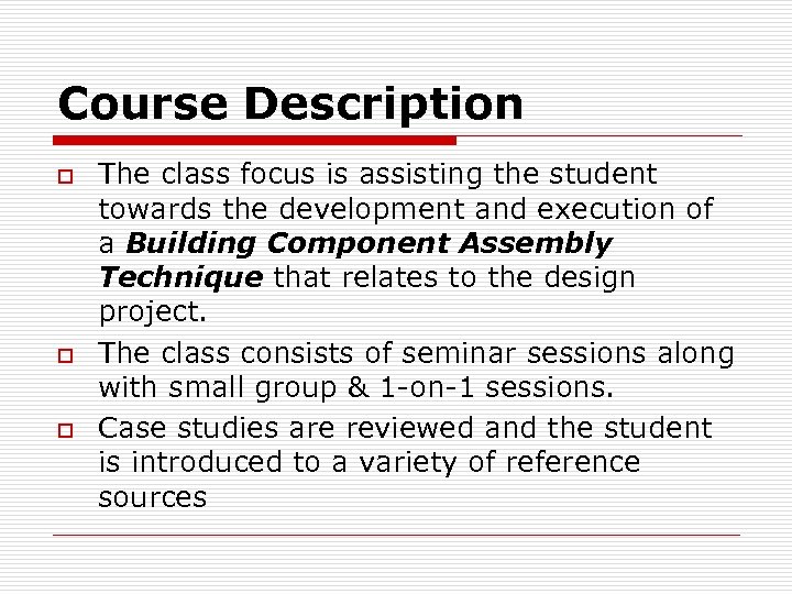 Course Description o o o The class focus is assisting the student towards the development and execution of a Building Component Assembly Technique that relates to the design project. The class consists of seminar sessions along with small group & 1 -on-1 sessions. Case studies are reviewed and the student is introduced to a variety of reference sources