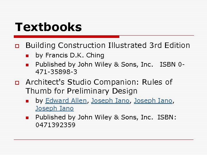 Textbooks o Building Construction Illustrated 3 rd Edition n n o by Francis D. K. Ching Published by John Wiley & Sons, Inc. 471 -35898 -3 ISBN 0 - Architect's Studio Companion: Rules of Thumb for Preliminary Design n n by Edward Allen, Joseph Iano, Joseph Iano Published by John Wiley & Sons, Inc. ISBN: 0471392359