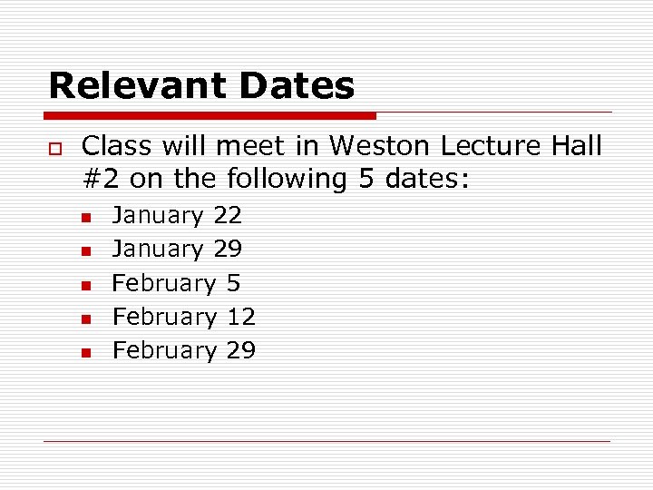Relevant Dates o Class will meet in Weston Lecture Hall #2 on the following 5 dates: n n n January 22 January 29 February 5 February 12 February 29