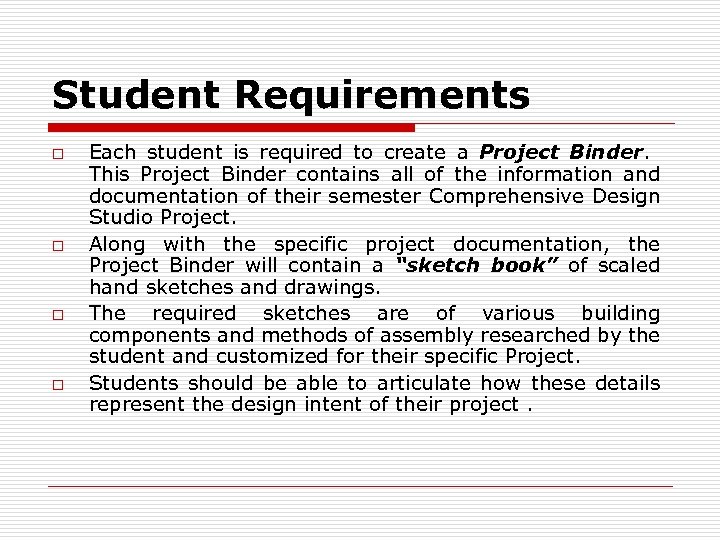 Student Requirements o o Each student is required to create a Project Binder. This Project Binder contains all of the information and documentation of their semester Comprehensive Design Studio Project. Along with the specific project documentation, the Project Binder will contain a “sketch book” of scaled hand sketches and drawings. The required sketches are of various building components and methods of assembly researched by the student and customized for their specific Project. Students should be able to articulate how these details represent the design intent of their project.