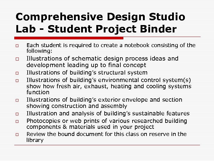 Comprehensive Design Studio Lab - Student Project Binder o o o o Each student is required to create a notebook consisting of the following: Illustrations of schematic design process ideas and development leading up to final concept Illustrations of building’s structural system Illustrations of building’s environmental control system(s) show fresh air, exhaust, heating and cooling systems function Illustrations of building’s exterior envelope and section showing construction and assembly Illustration and analysis of building’s sustainable features Photocopies or web prints of various researched building components & materials used in your project Review the bound document for this class on reserve in the library