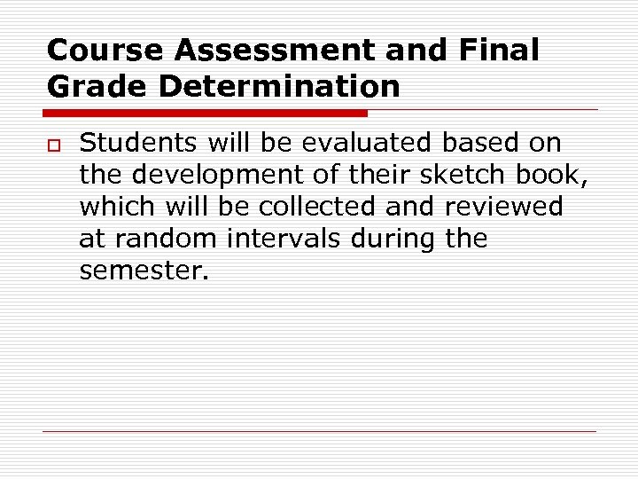 Course Assessment and Final Grade Determination o Students will be evaluated based on the development of their sketch book, which will be collected and reviewed at random intervals during the semester.