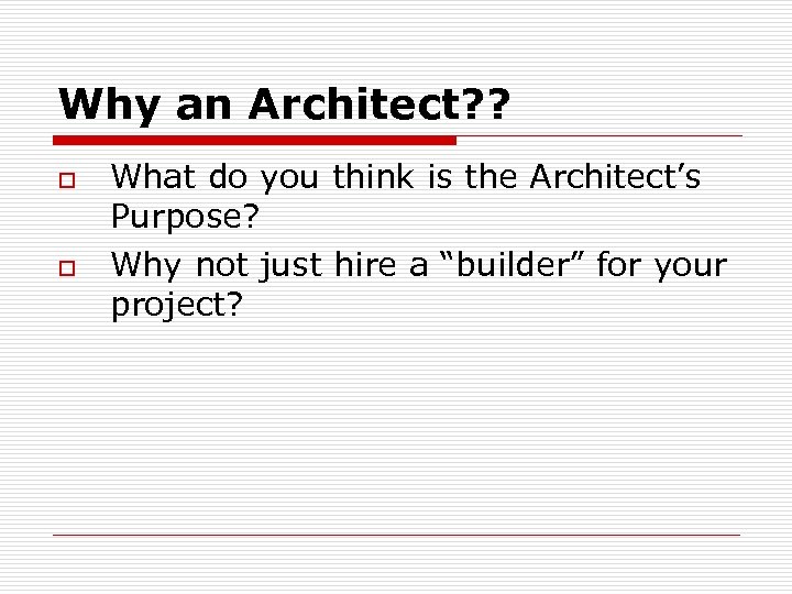 Why an Architect? ? o o What do you think is the Architect’s Purpose? Why not just hire a “builder” for your project?