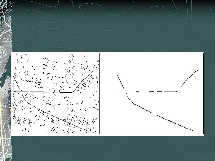 Hough transform Procedures Points in cartesian image space map to curves in the polar Hough parameter space. Curves by collinear points intersect in peaks (r, ). Intersection points characterize the straight line segments. Extract local maxima from the accumulator array (relative threshold). Mapping back from Hough space into image space.