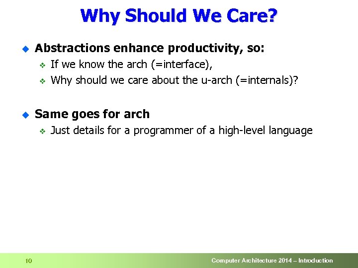 Why Should We Care? u Abstractions enhance productivity, so: v v u Same goes for arch v 10 If we know the arch (=interface), Why should we care about the u-arch (=internals)? Just details for a programmer of a high-level language Computer Architecture 2014 – Introduction