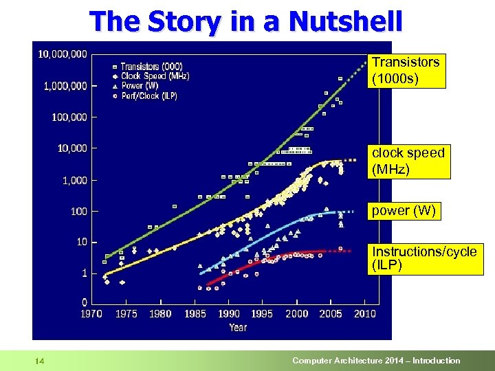 The Story in a Nutshell Transistors (1000 s) clock speed (MHz) power (W) Instructions/cycle (ILP) 14 Computer Architecture 2014 – Introduction