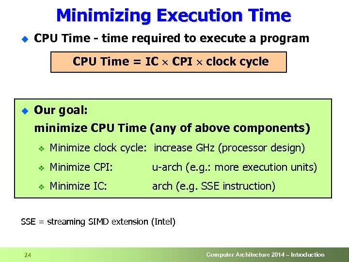 Minimizing Execution Time u CPU Time - time required to execute a program CPU Time = IC CPI clock cycle u Our goal: minimize CPU Time (any of above components) v Minimize clock cycle: increase GHz (processor design) v Minimize CPI: u-arch (e. g. : more execution units) v Minimize IC: arch (e. g. SSE instruction) SSE = streaming SIMD extension (Intel) 24 Computer Architecture 2014 – Introduction