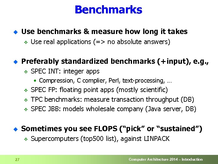 Performance Evaluation: How? u Performance depends on v v u 26 Application Input Mathematical analysis Computer Architecture 2014 – Introduction
