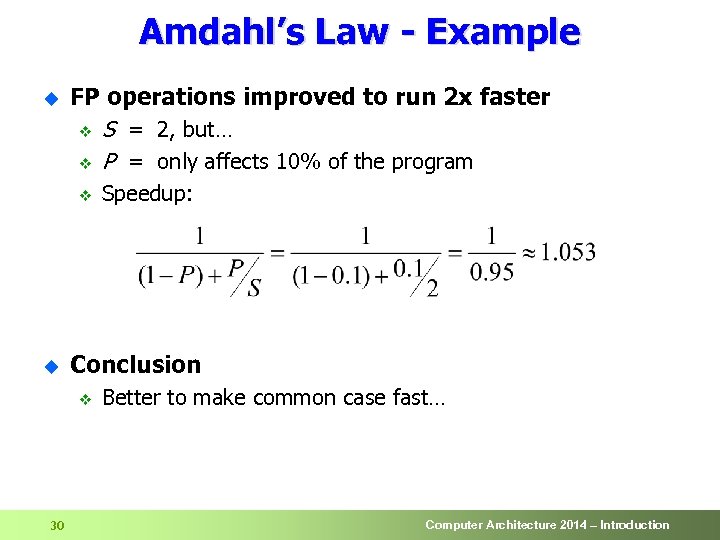 Amdahl’s Law u Suppose we accelerate the computation such that v P = portion of computation we make faster v S = speedup experienced by the portion we improved u For example v If an improvement can speedup 40% of the computation => P = 0. 4 v u 29 If the improvement makes the portion run twice as fast => S = 2 Then overall speedup = Computer Architecture 2014 – Introduction