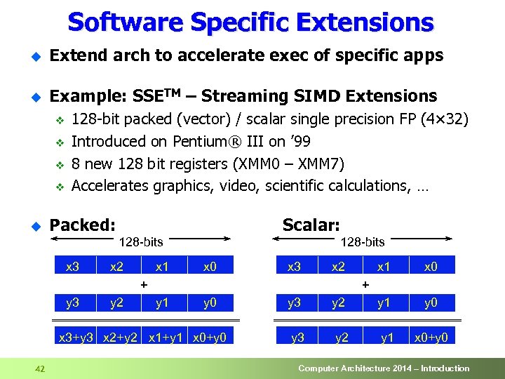 Software Specific Extensions u Extend arch to accelerate exec of specific apps u Example: SSETM – Streaming SIMD Extensions v v 128 -bit packed (vector) / scalar single precision FP (4× 32) Introduced on Pentium® III on ’ 99 8 new 128 bit registers (XMM 0 – XMM 7) Accelerates graphics, video, scientific calculations, … u Packed: Scalar: 128 -bits x 3 x 2 x 1 128 -bits x 0 x 3 x 2 + y 3 y 2 x 0 + y 1 y 0 x 3+y 3 x 2+y 2 x 1+y 1 x 0+y 0 42 x 1 y 3 y 2 y 1 y 0 y 3 y 2 y 1 x 0+y 0 Computer Architecture 2014 – Introduction