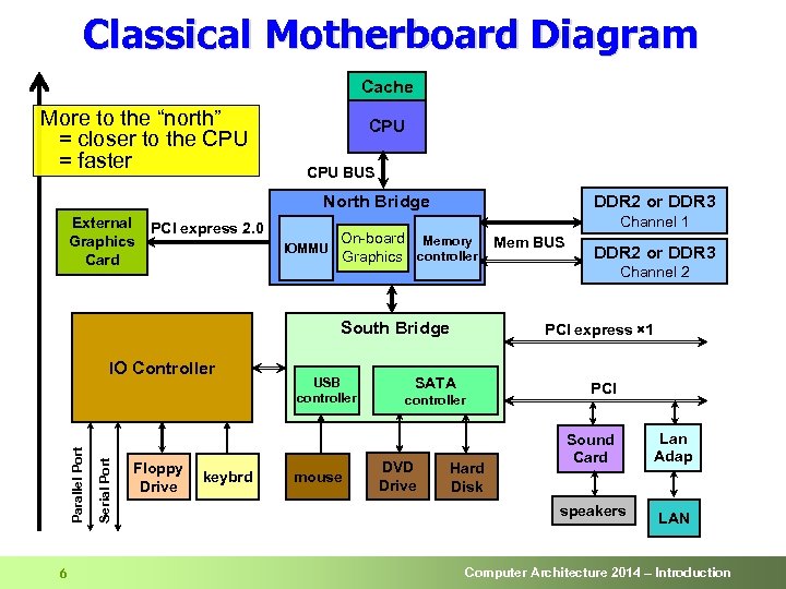 Classical Motherboard Diagram Cache More to the “north” = closer to the CPU = faster CPU BUS North Bridge External Graphics Card PCI express 2. 0 IOMMU DDR 2 or DDR 3 On-board Memory Graphics controller South Bridge 6 Serial Port Parallel Port IO Controller Floppy Drive keybrd USB controller mouse Mem BUS DDR 2 or DDR 3 Channel 2 PCI express × 1 SATA controller DVD Drive Channel 1 Hard Disk PCI Sound Card speakers Lan Adap LAN Computer Architecture 2014 – Introduction