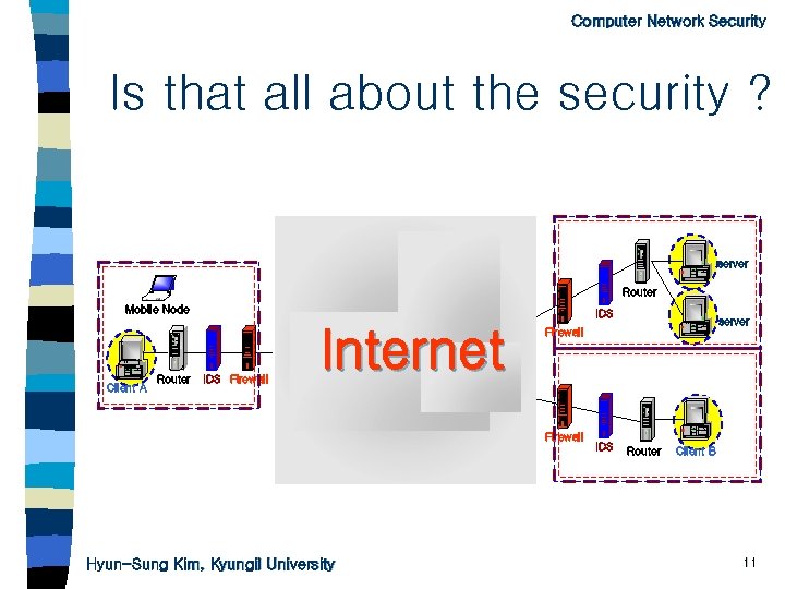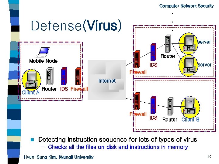 Computer Network Security . . . Defense(Virus) server Router Mobile Node server IDS Firewall Internet Client A Router IDS Firewall n IDS Router Client B Detecting instruction sequence for lots of types of virus – Checks all the files on disk and instructions in memory Hyun-Sung Kim, Kyungil University 10