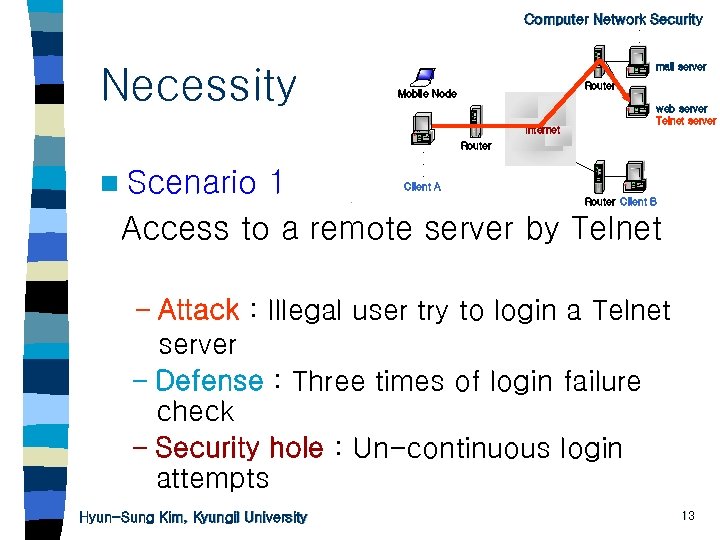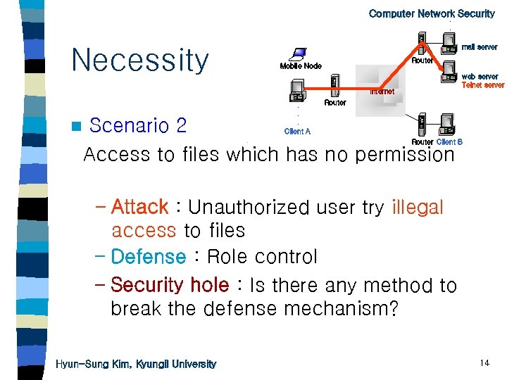 . Computer Network Security. . Necessity mail server Router Mobile Node Internet n Scenario . . . Client A web server Telnet server Router 1 Access to a remote server by Telnet Router Client B – Attack : Illegal user try to login a Telnet server – Defense : Three times of login failure check – Security hole : Un-continuous login attempts Hyun-Sung Kim, Kyungil University 13