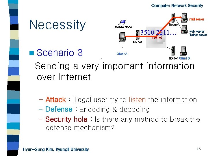 . Computer Network Security. . Necessity mail server Router Mobile Node web server Telnet server Internet n . . . Client A Router Scenario 2 Access to files which has no permission Router Client B – Attack : Unauthorized user try illegal access to files – Defense : Role control – Security hole : Is there any method to break the defense mechanism? Hyun-Sung Kim, Kyungil University 14