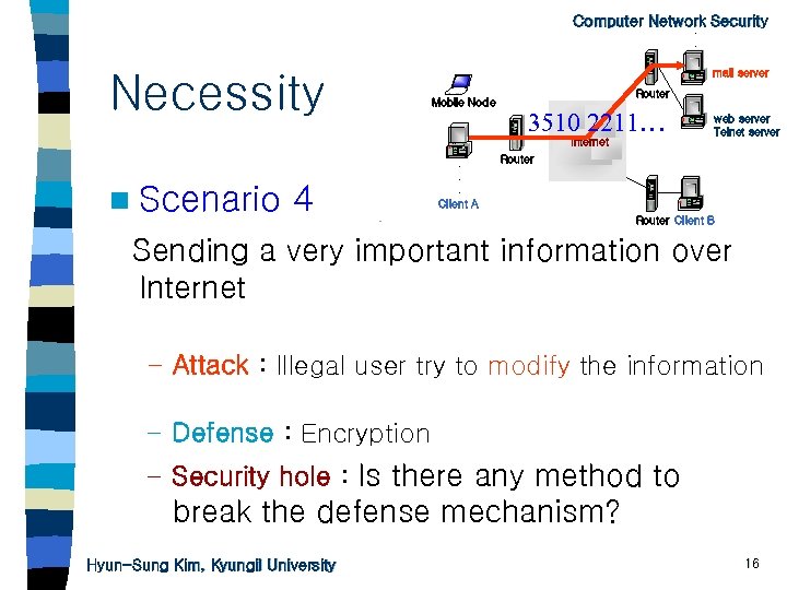 . Computer Network Security. . Necessity mail server Mobile Node Router 3510 2211… Internet n Scenario . . . Client A web server Telnet server Router 3 Sending a very important information over Internet Router Client B – Attack : Illegal user try to listen the information – Defense : Encoding & decoding – Security hole : Is there any method to break the defense mechanism? Hyun-Sung Kim, Kyungil University 15