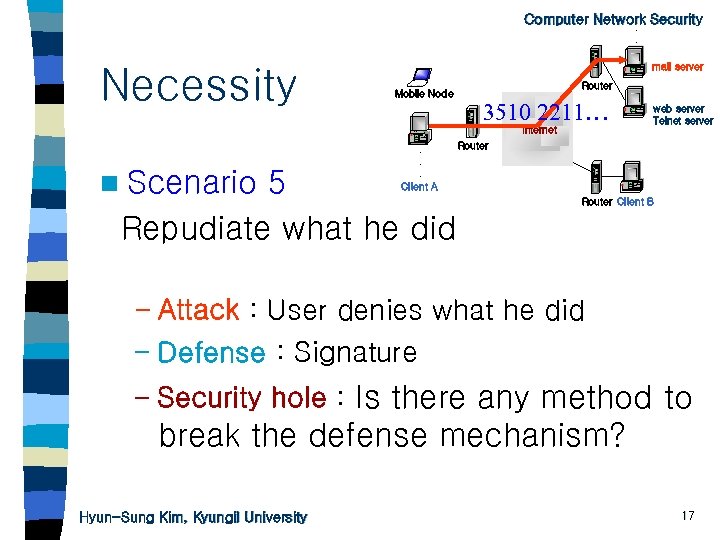 . Computer Network Security. . Necessity mail server Mobile Node Router 3510 2211… Internet n Scenario 4 . . . Client A web server Telnet server Router Client B Sending a very important information over Internet – Attack : Illegal user try to modify the information – Defense : Encryption – Security hole : Is there any method to break the defense mechanism? Hyun-Sung Kim, Kyungil University 16