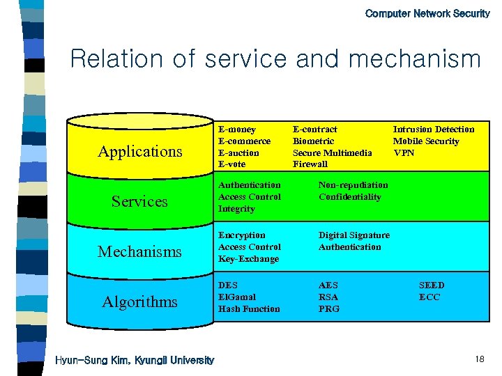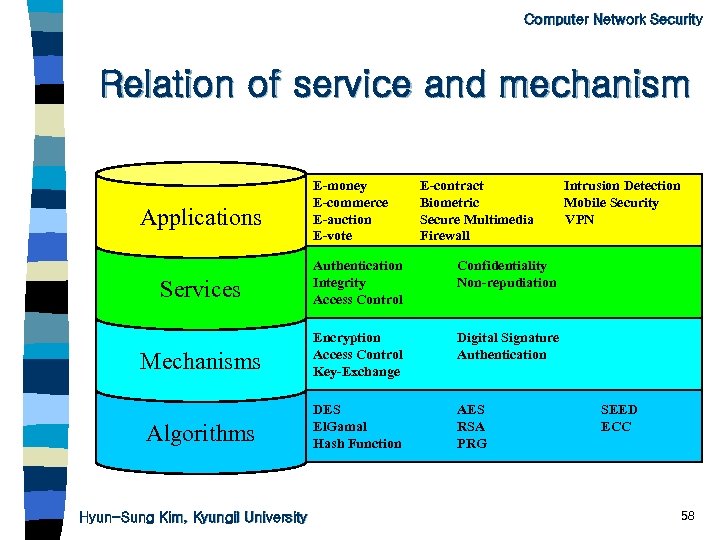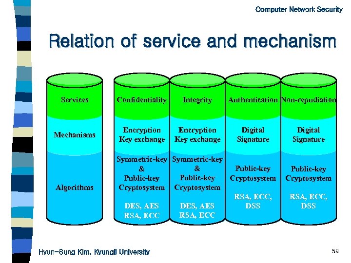 Computer Network Security Relation of service and mechanism Services Confidentiality Integrity Mechanisms Encryption Key exchange Algorithms Symmetric-key & Public-key Cryptosystem RSA, ECC, DES, AES DSS DES, AES RSA, ECC Hyun-Sung Kim, Kyungil University Authentication Non-repudiation Digital Signature Public-key Cryptosystem RSA, ECC, DSS 59
