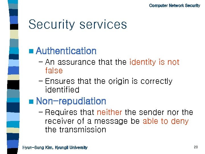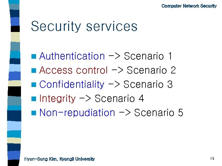 Computer Network Security services n Authentication -> Scenario 1 n Access control -> Scenario 2 n Confidentiality -> Scenario 3 n Integrity -> Scenario 4 n Non-repudiation -> Scenario 5 Hyun-Sung Kim, Kyungil University 19