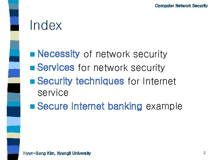 Computer Network Security Index n Necessity of network security n Services for network security n Security techniques for Internet service n Secure Internet banking example Hyun-Sung Kim, Kyungil University 2