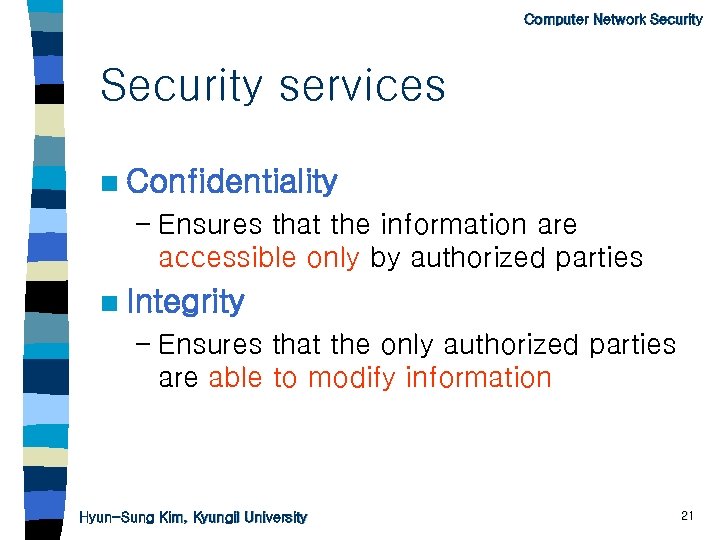 Computer Network Security services n Authentication – An assurance that the identity is not false – Ensures that the origin is correctly identified n Non-repudiation – Requires that neither the sender nor the receiver of a message be able to deny the transmission Hyun-Sung Kim, Kyungil University 20
