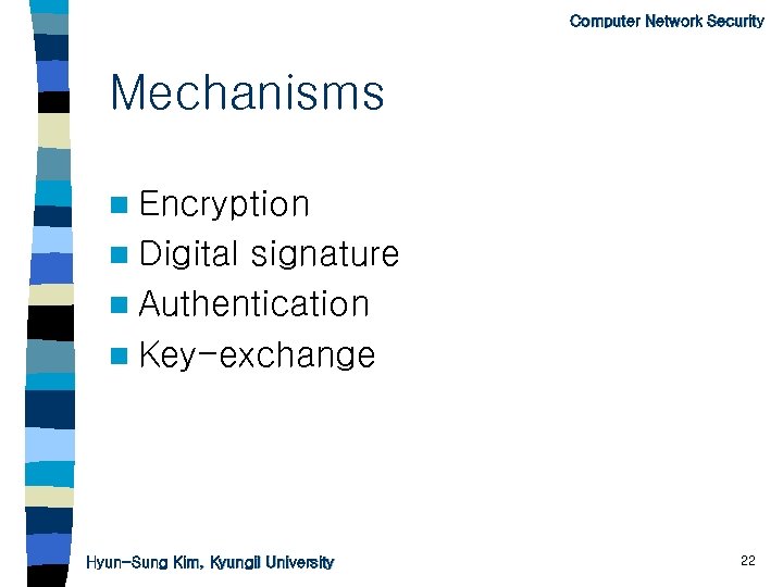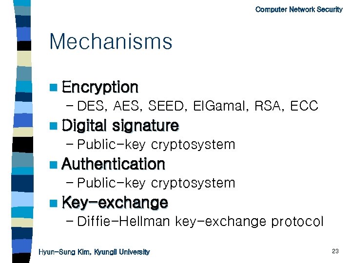 Computer Network Security Mechanisms n Encryption n Digital signature n Authentication n Key-exchange Hyun-Sung Kim, Kyungil University 22
