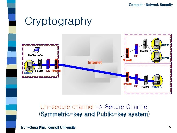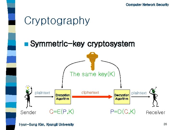 Computer Network Security Cryptography server Router Mobile Node IDS Internet Client A Router server Firewall IDS Router Client B Un-secure channel => Secure Channel (Symmetric-key and Public-key system) system Hyun-Sung Kim, Kyungil University 25