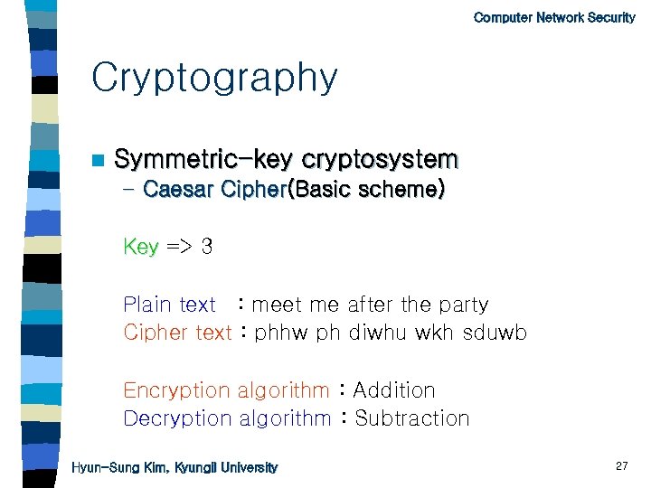 Computer Network Security Cryptography n Symmetric-key cryptosystem The same key(K) K plaintext Sender Encryption Algorithm C=E(P, K) Hyun-Sung Kim, Kyungil University ciphertext Decryption Algorithm plaintext P=D(C, K) K Receiver 26