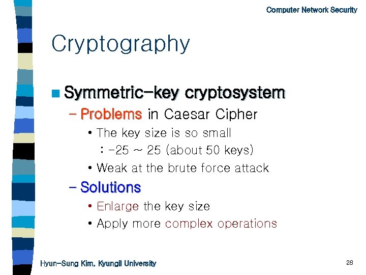 Computer Network Security Cryptography n Symmetric-key cryptosystem – Caesar Cipher(Basic scheme) Key => 3 Plain text : meet me after the party Cipher text : phhw ph diwhu wkh sduwb Encryption algorithm : Addition Decryption algorithm : Subtraction Hyun-Sung Kim, Kyungil University 27