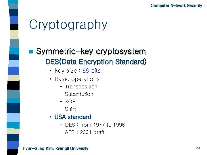Computer Network Security Cryptography n Symmetric-key cryptosystem – Problems in Caesar Cipher • The key size is so small : -25 ~ 25 (about 50 keys) • Weak at the brute force attack – Solutions • Enlarge the key size • Apply more complex operations Hyun-Sung Kim, Kyungil University 28
