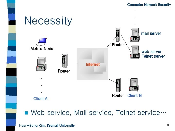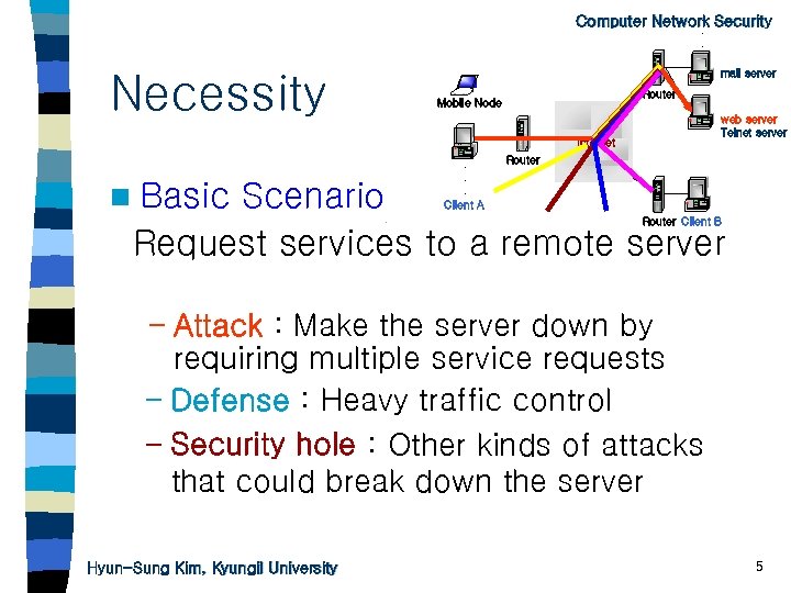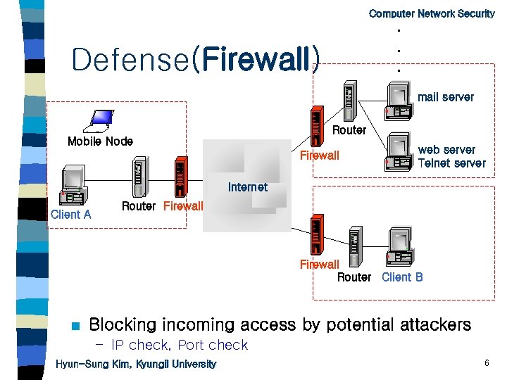 . Computer Network Security. . Necessity mail server Router Mobile Node web server Telnet server Internet n Basic . . . Client A Router Scenario Request services to a remote server Router Client B – Attack : Make the server down by requiring multiple service requests – Defense : Heavy traffic control – Security hole : Other kinds of attacks that could break down the server Hyun-Sung Kim, Kyungil University 5