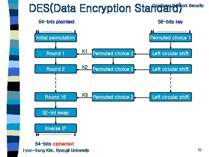 Computer Network Security Cryptography n Symmetric-key cryptosystem – DES(Data Encryption Standard) • Key size : 56 bits • Basic operations – – Transposition Substitution XOR Shift • USA standard – DES : from 1977 to 1998 – AES : 2001 draft Hyun-Sung Kim, Kyungil University 29